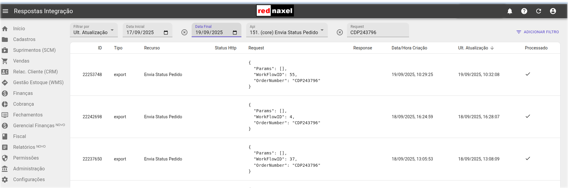 Possibilidade de filtrar pelo código ou qualquer palavra dentro dos dados do request. Filtro por dataini e datafim juntamente com o filtrar por: "Ult. Atualização" ou "Data Criação". Filtro também por "ID Objeto", podendo ser o código do produto, número pedido ou id_pessoa.