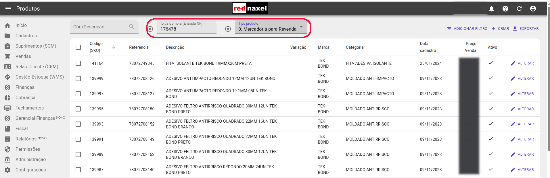 Adicionado os filtros de ID da Compra (entrada NF), e Tipo Produto (0. Mercadoria pra Revenda, 1. Matéria Prima, 2. Embalagem, etc). Na edição em lote do produtos foi adicionado o campo ICMS Efetivo (ICMS de Entrada). Também foi colocado permissão apara editar o Custo+IPI da última entrada (CMV)- Permissão 2407.