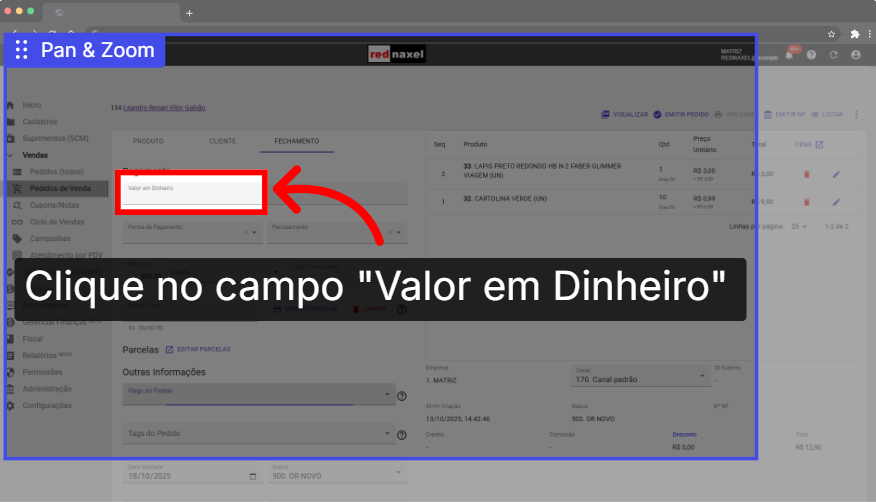 O campo "Valor em dinheiro" será utilizado quando o pagamento do pedido for efetuado em dinheiro. Para usá-lo, clique sobre ele e informe o valor do pagamento.