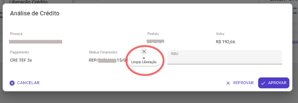 No componente de Liberação de Crédito, utilizado no Kanban, na tela de Vendas e na tela de Pedidos (todos), foi incluído um novo botão que permite limpar a liberação de crédito, alterando o status de Aprovado ou Reprovado para Pendente.