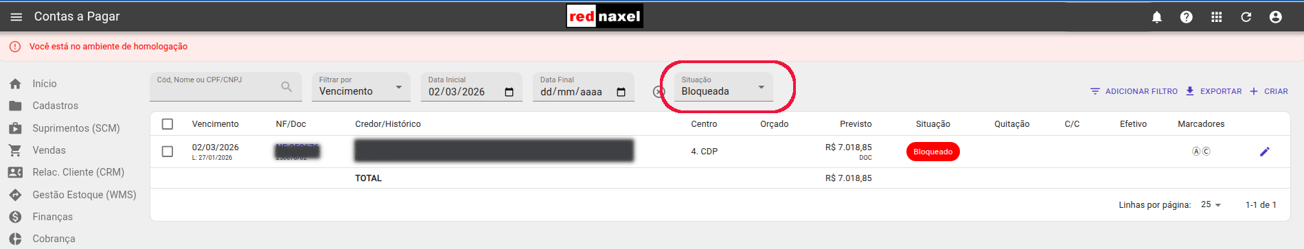 Contas a Pagar (Filtro Situação : Bloqueada)